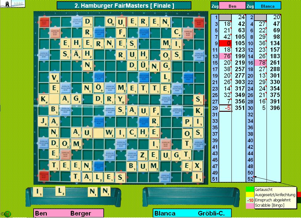R E S Ü M E E Spannende Partien, erstmalig mit individuellem Zeitkontingent ausgetragen und auch so manche Überraschung - für Langeweile gab's keine Zeit bei den 2.Hamburger FairMasters! "Scrabble"-Schützenkönig wurde Heinz-Jürgen Michel aus Syke; er brachte es in 9 Partien auf insgesamt 15 Abräumer! Die meisten Punkte [576] in einer einzigen Partie erzielte Maria Feige, ebenso wie den besten Zug [131] beides in der Begegnug mit Britta Sander. Dafür gab es 3 Sonderpreise: Gutscheine für Bücher und Kosmetika. Das Finale bestritten in der sehr angenehmen Athmosphäre eines Hörsaals im Hauptgebäude der Hamburger Uni Blanca Gröbli-Canonica (Oberuzwil/CH) und Ben Berger (Konstanz). Das neue Gesicht in der deutschen SCRABBLE Turnier- landschaft hatte es auf Anhieb bis ins Finale geschafft! Wir sagen: Nur weiter so!! Nach einem Patzer von Ben [er legte HÖ - ein unzulässiges Wort], konnte Blanca das Hinspiel deutlich für sich entscheiden. Das Rückspiel war sehr spannend und Ben im "Dauerunglück im Glück": über mehrere Züge hinweg lachten ihn zwei Blankos/Joker auf dem Bänkchen an, die er kurz vor Spielende für insgesamt klägliche 37 Punkte verschleudern musste! |